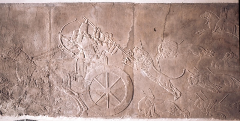 Ninova’dan (günümüz Irak’ında) gelen bu kraliyet aslan avı kabartması, sakalsız saray mensuplarını kraliyet arabasında gösteriyor. C: The Trustees of the British Museum