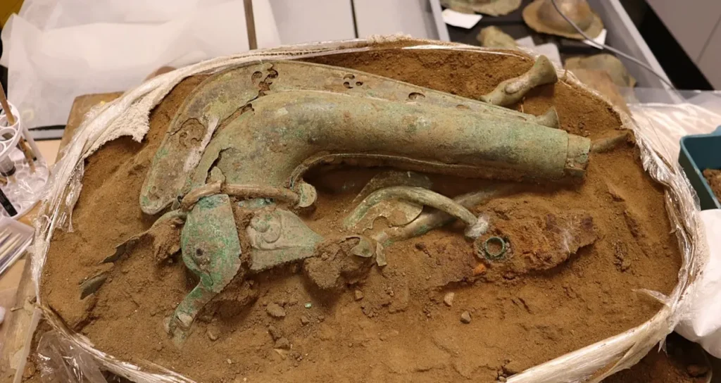 Buluntu yalnızca savaş borularıyla sınırlı değil. Hazine içinde, bir askeri sancaktan geldiği düşünülen bronz levhadan yapılmış bir yaban domuzu başı, beş kalkan göbeği ve kökeni henüz belirlenemeyen bir demir nesne de yer alıyor. Bu objeler, keşfin askeri ve törensel bir bağlama işaret edebileceğini düşündürüyor.